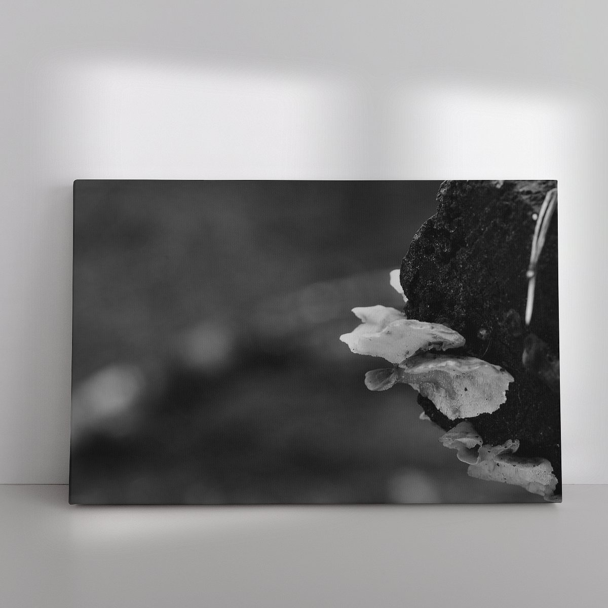 De tweede foto dat ik bij Werk aan de muur heb gezet is de foto Paar kleine paddenstoeltjes in zwart-wit(link). Ook voor deze foto heb ik een klein reflectiescherm gebruikt om de onderkant van deze zwammen uit te lichten.