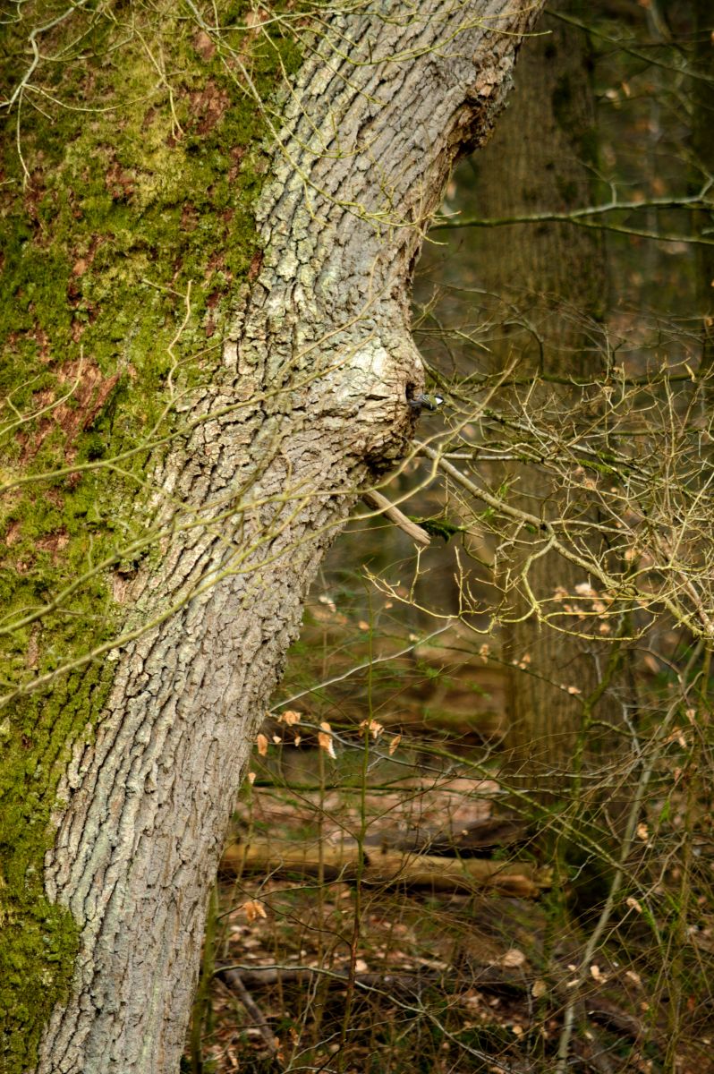 Vanmiddag zag ik nog een vogel een boom in vliegen die vermoedelijk met een nest bezig was, in eerste instantie dacht ik aan een specht. Ik heb er een foto van gemaakt en bij het bekijken van de foto leek het een koolmeespaartje die bezig was.
